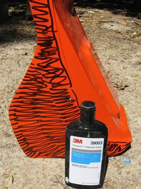 I cover all the gelcoat with a fat black magic marker. That is my sanding guide. With 2000 grit I wet sand until all the marker is gone. Always, scratches and pits remain. I sand these points even more, guarding against sanding all the way through the gelcoat, but it does happen. For stubborn scratches and pits I use a Dremel tool to grind down below the problem. Then I mix up matching orange gelcoat and fill the little problems. Sometimes they are as small as a dot at the end of this sentence. After they cure 6 hours later, it's sand again until no trace is left of them.