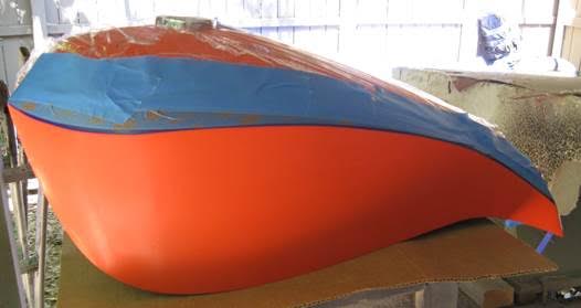 In the case of the tank shown here, the gelcoat was thin on one side, and if you looked closely you could see the dark matrix underneath showing through oh so subtly. I had to spray the whole side with a layer of orange Preval gelcoat with a Preval sprayer. Then the sanding process starts all over again.