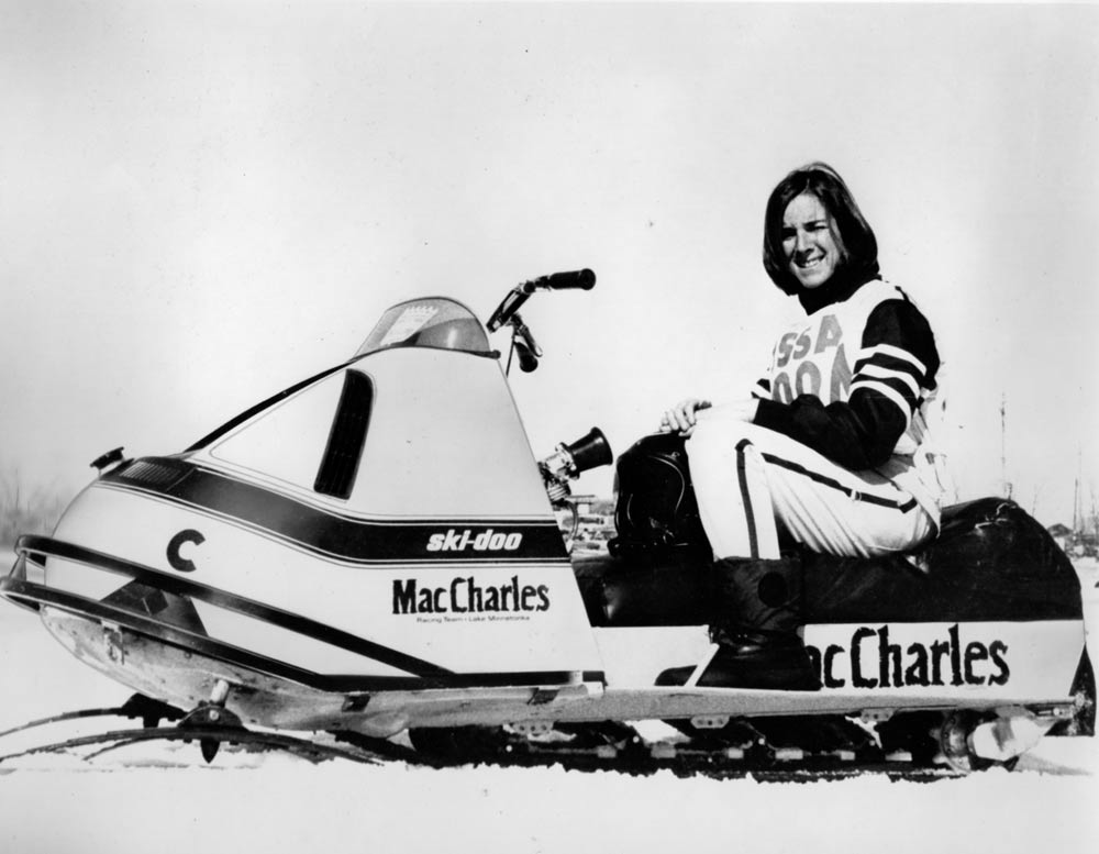 Mollie was an unusual as a powder puff racer. Most gals displayed a reserved demeanor on the track. Mollie did not. She was aggressive, somewhat reckless and was driven to win and she did—almost always. In one contest she beat nationally known Polaris driver Dorothy Mercer. Mollie raced a 292 Blizzard. Her off-track time centered on being a house wife, mother of two boys and a secretary for various companies. In 1970 her total money winnings was over $250 and she won 17 trophies—that was a big thing back then. In 1973 riding Polaris 295cc stock and mods, Mollie was season high points champion in the American Snowmobile Assn in; 300 stock Powder Puff, 300 mod PP, 340 mod PP and second in 340 stock PPthe only classes for women.