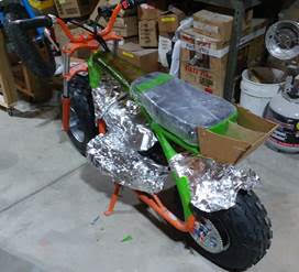 This is the very beginnings of a body. I’ve formed a box of cardboard behind the seat into which I will pour epoxy foam to shape the rear of the fender. If you look closely at the backbones you’ll see the rudimentary floor of the tank. The green tape and tin foil protects my 200 from looking like the floor under the front fender.