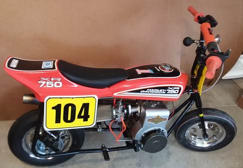 Dirt Track MiniBuilt for dirt track racing in pull start class. Extended Azusa frame to curb unexpected front wheel lofting of stock short frame. Modified 5 hp Briggs flat head. Tall handlebars and big wheels raise seat level for comfortable adult use. Tall bars won’t trap left knee in corners. Actual 1980 Harley XR 750 tank with sectioned and shortened XR tail. Custom seat from scratch. |
