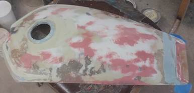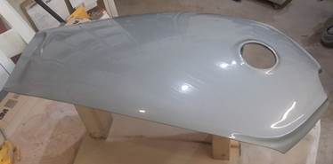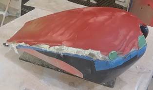 Here’s the dog deck cover midway through the smoothing process. I created a collar around the filler neck hole and on the front of the tank you see marks where I wanted reinforcement so the thin glass wouldn’t curl away from the tank.
