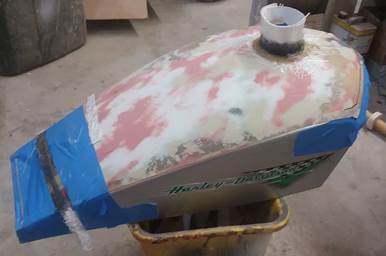 I laid down two layers of fiberglass on a tank pattern that matched his tank and began to smooth the surface.