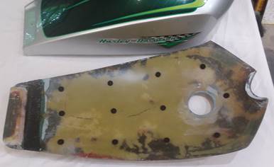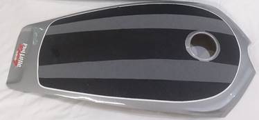 I even put little felt pads on the underside to protect his tank. In case you wonder how the piece stays on-it has a lip that catches the tank in front, the filler neck hole holds it laterally and a bit of Velcro in the rear does it.