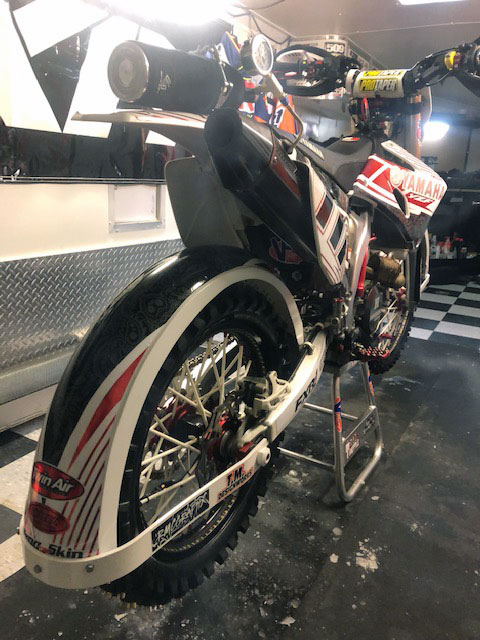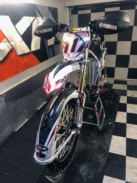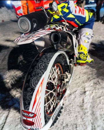 His Facebook shows him having fun in those freaky river rod boats that turn on a dime and run over ground. Come winter he races the ice. Here are a couple of shots of his bike with my ice fenders. To my knowledge he is the only one to do a superlative graphics job on the fenders which relate to the whole bike.