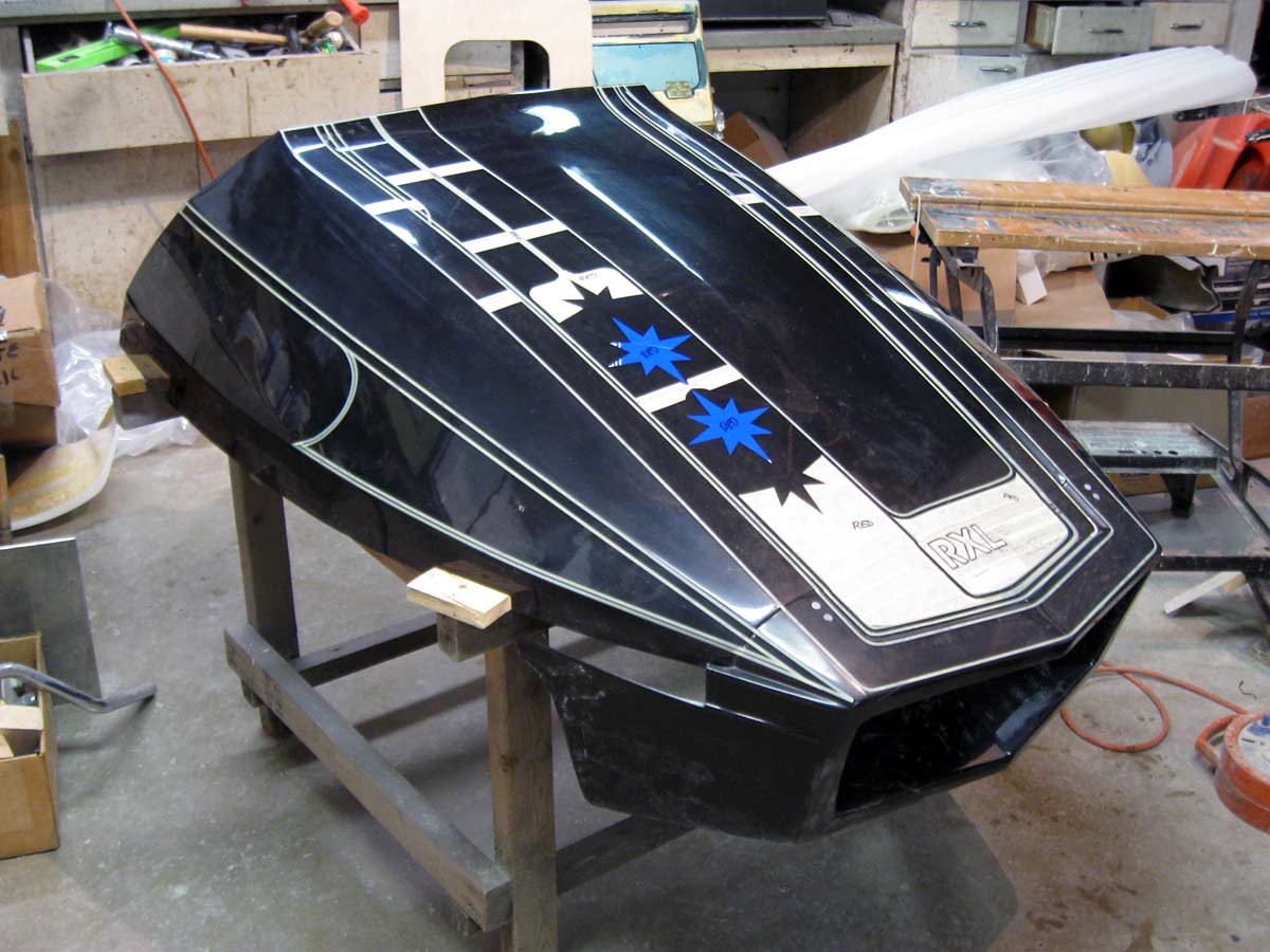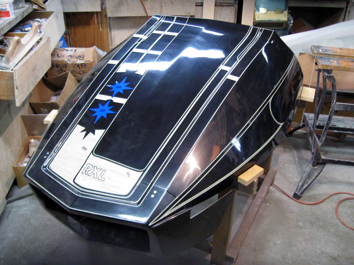 At this point we are in the middle of fine tuning the RXL graphics. It's not an easy task. We had to adapt the RXL theme to the precise shape of my RXL hood and nose. The various parts of this sticker package are keyed to the mold lines in the hood. Here Cece, my long time sign gal, is in round two of the fine tune process.