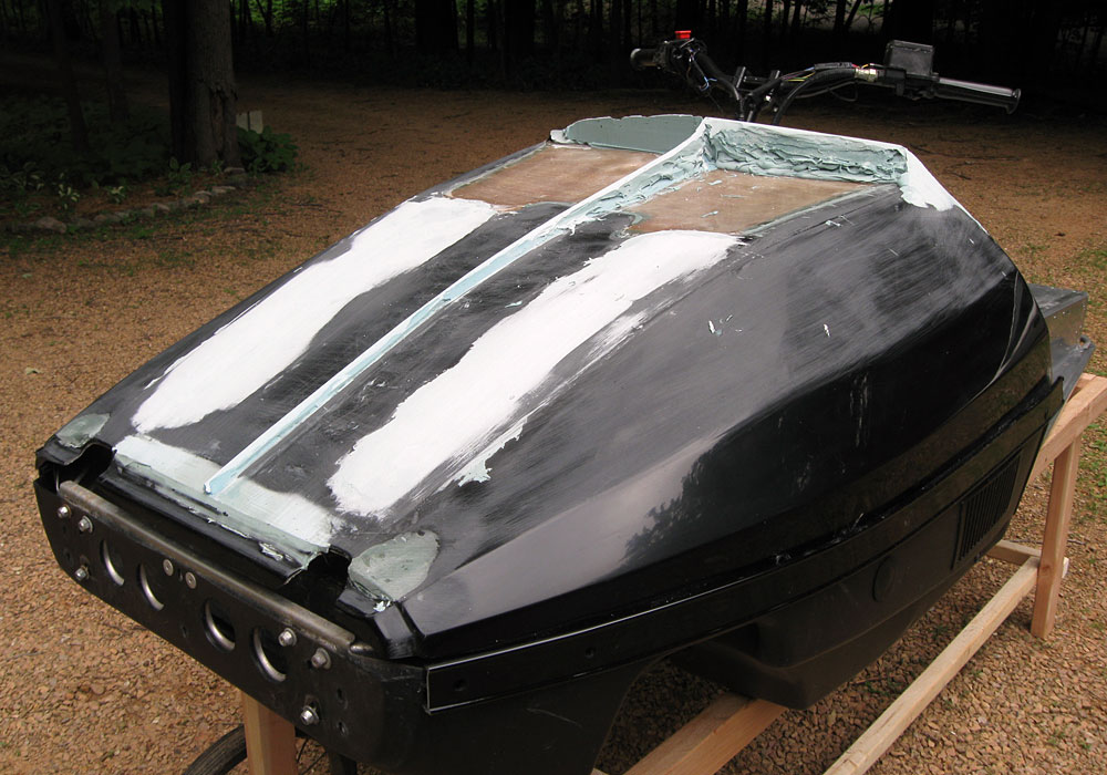 Okay, you can see that surgery has begun. I knocked off the headlight pod. I sent a questionnaire to all you who have asked to be on my "list" for progress news. I asked "should I make the hood with scoops?" The answer you sent back was a resounding "NO", no scoops. Note: work will stop for a period on the RXL. It won't be ready until spring so it's going to be a 2012/13 release. I'm going to jump over to my 650 Yamaha Storm motorcycle kit and finish it for a Spring into. Then I'll get back to the RXL.