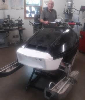 That feller is Tom Dousette. He is the guy I go to for specially made parts. This weekend I took him my sled, hood, nose and lift. I have challenged him to develop my RXL hinges. At first blush, it doesn’t look like an easy project. There are issues of having the front hood edge having lift up and forward over the nose. It may come that I wouldn’t be able to have invisible hinges because the pivot point has to be where nose and hood meet. We all are going to have another issue. As the hood rises, it will probably contact the handle bars. So we all have to get used to maneuvering the hood rear around scratch-able contacts. I will have a procedure and an Indian chant to get this done cleanly. More info when I have it.
