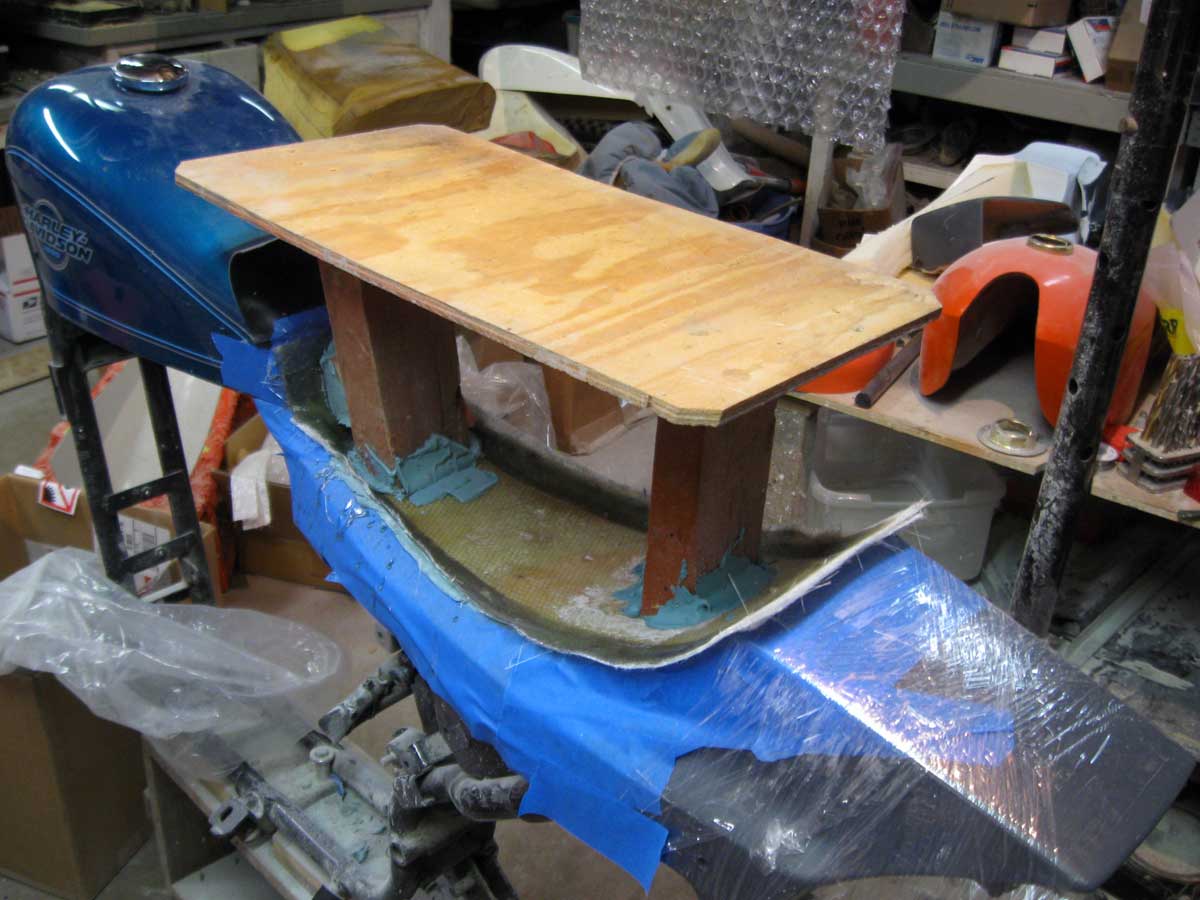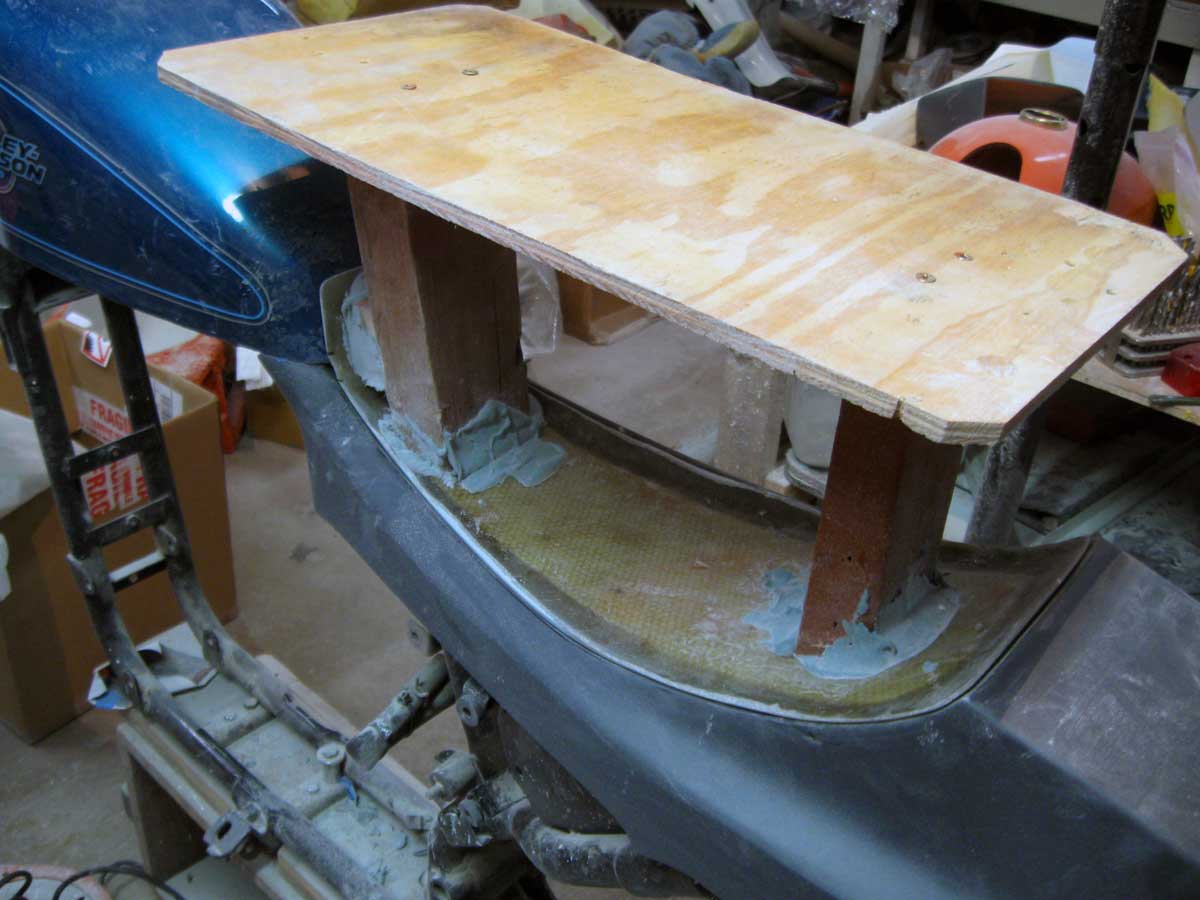 This week's task was to make the seat base. Here is the raw fiberglass laid into the fender well designed for the seat. Before I pulled it off the fender I put legs on it. The legs elevate the seat base for applying the sandable finish on it later. You'll see it in an advanced stage next time.