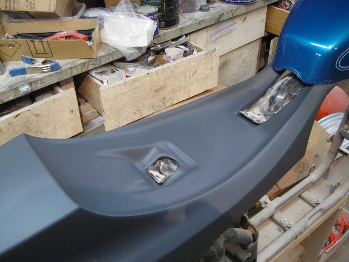 The project is moving along. You'll notice two holes in the tail sides at the rear. The lower hole is a secondary mount for 1994 and newer frames. The upper hole is for 1993 and older frames. The '94 tab will be simply cut off for 1993 and older applications. The primary tail mount is that depression in the middle under that seat-it picks up the tab on the cross tube and the front is secured by tab behind the tank.