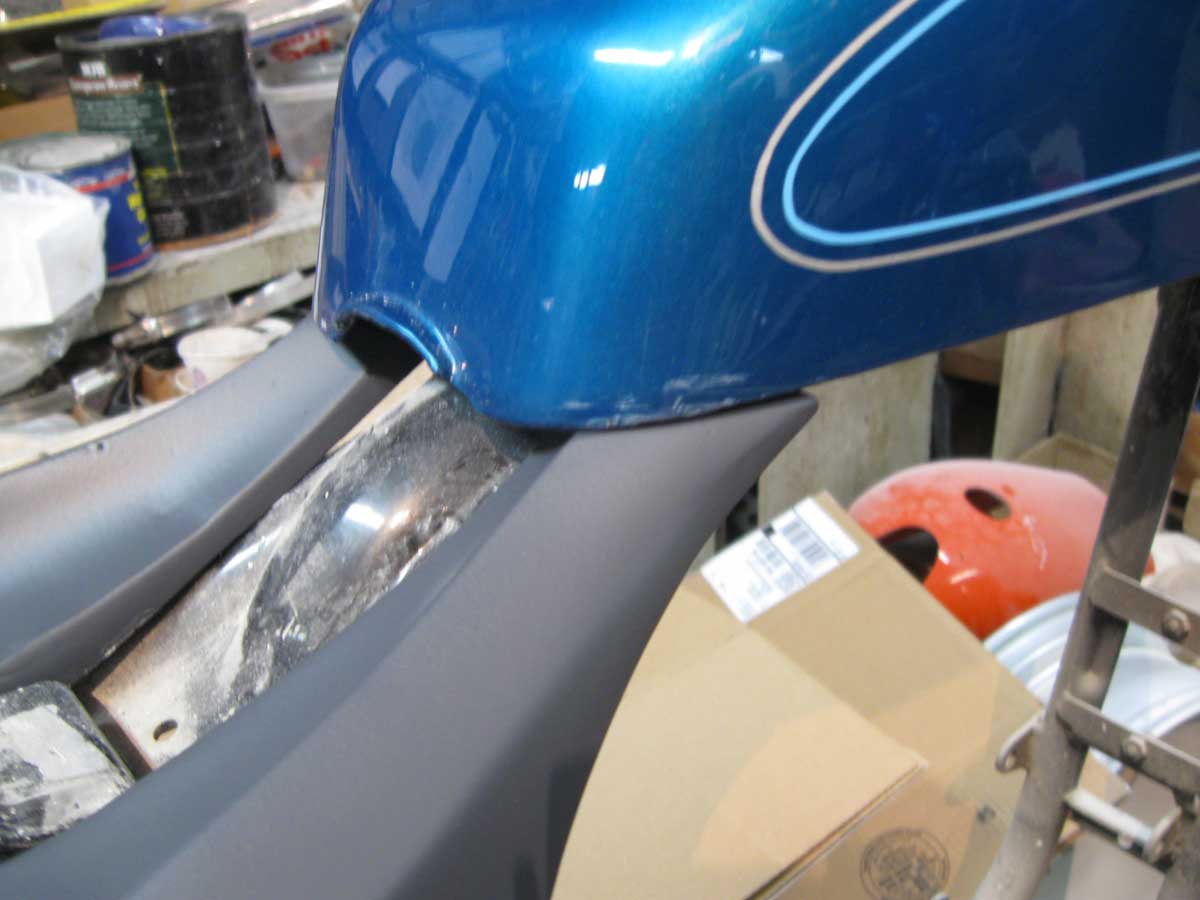 Now you can see how the seat base it fits into the fender well. What is hard to see is the front which runs part way up the back of the tank: