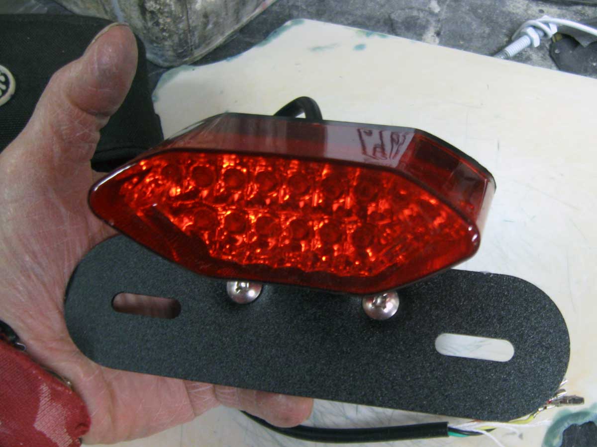 Work will now halt because I am waiting to make a mount for a nifty new LED taillight/brake light with... get this--turn signals. This will really clean up the back end of your bike. The use of a side license plate mount will be the finishing touch.