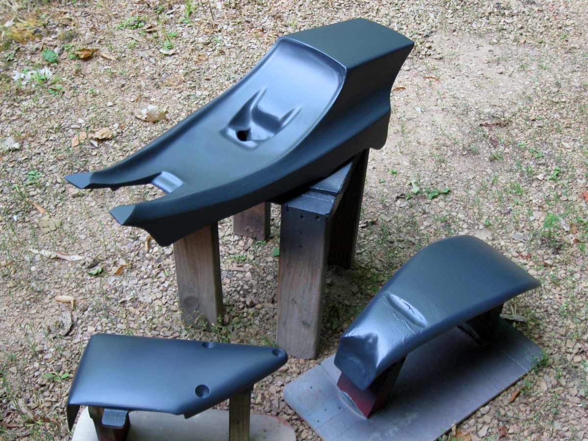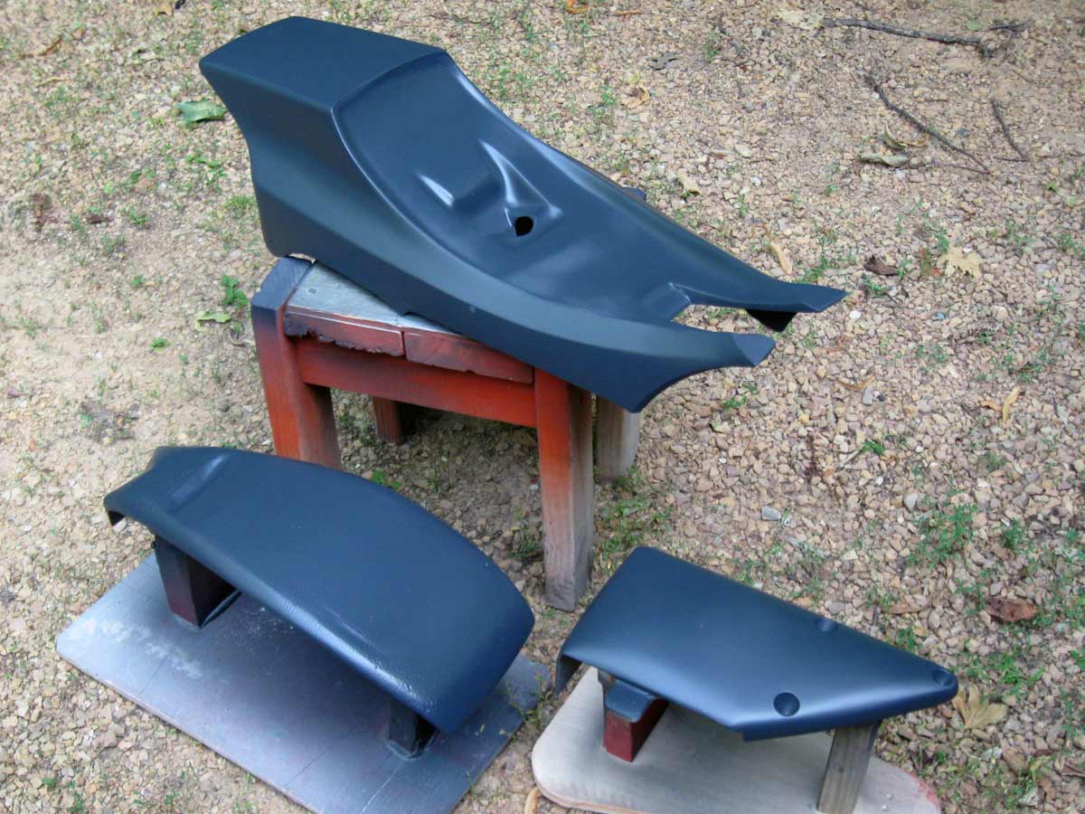 Okay the shaping process is virtually done. As you can see I have the final primer coat on all the parts. This stuff is what I sand to 2000 grit and polish so molds can be made. I probably have 2 weeks worth of sanding to do and the polishing/waxing process will take a week then it's off to the mold maker we go. I guess that they will take a minimum of two weeks to make the molds then we can make the first parts. After that I have to make the taillight and license plate holder out of fiberglass and have my machinist make the aluminum mounts. This process is agonizingly slow for you all I know. I will send another report in about 2 weeks.